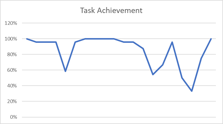 Some tasks are difficult to execute. The lowest one, the dip that shows 33%, is “wrapping my thoughts” at the end of the day. I made a pact that each night, I’d evaluate my days and write down what went well as planned and what went wrong. I maintain a database in Obsidian, but once I started tracking, I simply forgot to do that.